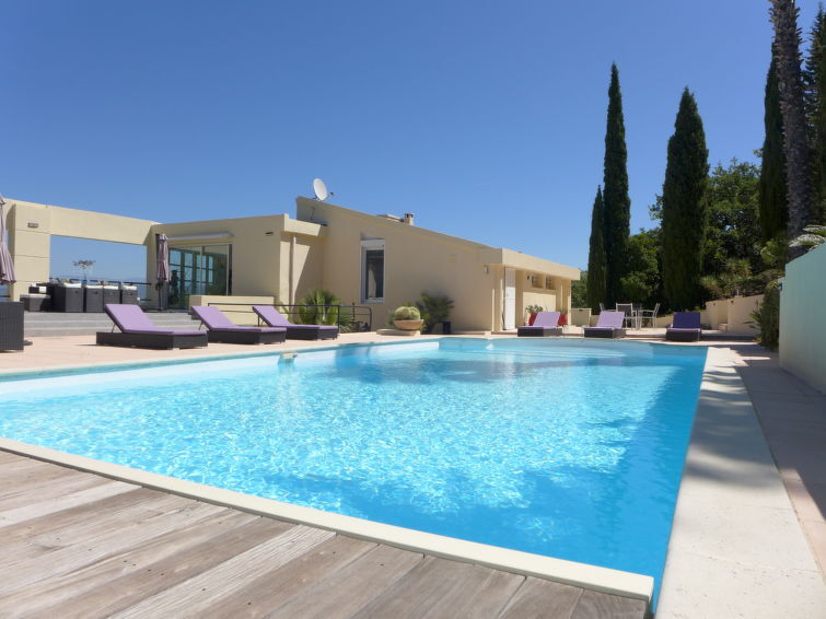 Moderne eengezinswoning "Les Toscanes", van 2 verdiepingen, omgeven door bomen. Huurobject bestaande uit hoofd-/ bijgebouw, buiten de plaats Roquebrune sur Argens, rustige, zonnige, verhoogde ligging op een heuvel, in een woonwijk, gebied met weinig verkeer, te midden van groen. Voor alleengebruik: wilde tuin 1 ha (omheind), openluchtzwembad hoekig, verwarmd, geen inkijk (12 x 6 m, 60 - 170 cm diepte, seizoensgebonden beschikbaarheid: 15.Mei. - 15.Okt.) met oprolbaar afdekscherm en alarminstallatie. Buitendouche, poolhouse, terras (170 m2), barbecue. In het huis: alarmsysteem. 1 maal per week schoonmaak op verzoek (extra). Winkel 3 km, bushalte "Roquebrune Village" 2 km, treinstation "Fréjus" 20 km, zandstrand "Plage de Saint Aygulf" 15 km kiezelstrand "Calanque des Louvans" 14 km, park "Areca" 14 km, thermaalbad "Thalasso de Port Fréjus" 20 km, meer Lac de l'Arèna 3 km. Jachthaven 15 km, golfterrein (18 holes) 10 km, zeilschool 15 km, manege 7 km, sportcentrum 4 km, wandelroutes 100 m vanaf het huis. Attracties in de buurt: Base Nature du Rocher 4 km, Roquebrune sur Argens 3 km, Saint Aygulf 15 km, Aqualand, Luna park 20 km, Sainte Maxime 24 km, Saint Tropez 40 km. Bekende skigebieden kunnen gemakkelijk worden bereikt: Auron, Isola 2000 155 km. Bekende meren kunnen gemakkelijk worden bereikt: Lac de St Cassien 50 km, Lac du Du Verdon 95 km. Wandelgebied Col de Valdingarde 5 km, Estérel 25 km. Auto noodzakelijk. Niet geschikt voor kleine kinderen. De eigenaar accepteert geen jeugdgroepen. Gesloten residentie met een elektrische deur.