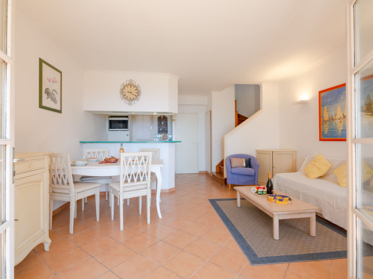 "Cap Estérel - Le Hameau (Mini Villa 35)", huis in een rij 3-kamers 35 m2 op 2 verdiepingen op de 2e verdieping. Mooi en gezellig ingericht: woon-/eetkamer met TV (Flatscreen TV). Uitgang naar het terras, naar de zitplaats in de tuin. Open keuken (oven, afwasmachine, 4 keramische glas kookplaten, broodrooster, waterkoker, magnetron, elektrische koffiemachine). Aparte WC. Bovenverdieping: 1 kamer met 2 bedden (90 cm, lengte 190 cm). 1 kamer met 1 2-pers bed (1 x 140 cm, lengte 190 cm), bad. Douche/WC. Elektrische verwarming. Terras 15 m2, zithoek in de tuin 15 m2. Terrasmeubelen, ligstoelen. Mooi uitzicht op zee. Ter beschikking: wasmachine. Internet (Internet (WiFi), extra). Parkeerplaats (1 Auto). Geschikt voor families. Niet rokers woning. Rookmelders. Aanbod door een particulier volgens art. 155, IV van CGI.