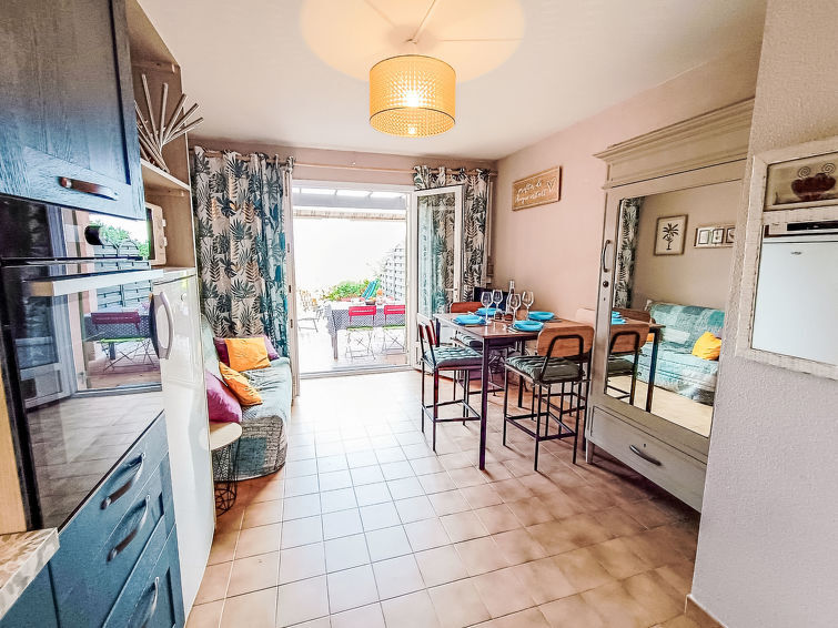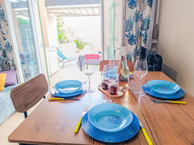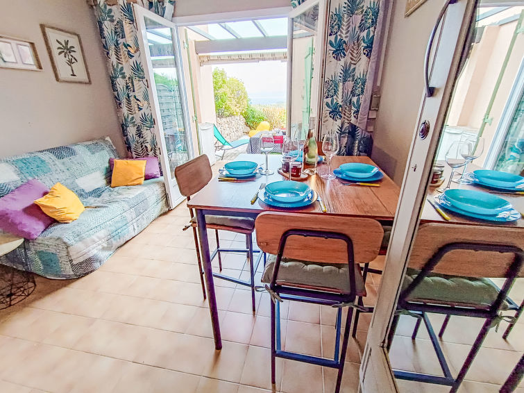 Huis in een rij 3-kamers 40 m2 op 2 verdiepingen. Woon-/eetkamer. Uitgang naar het terras, naar de zitplaats in de tuin. Kookhoek (oven, 4 inductiekookplaten, waterkoker, magnetron, diepvriezer, elektrische koffiemachine). Aparte WC. Bovenverdieping: 1 kamer met 1 2-pers bed (1 x 140 cm, lengte 190 cm), elektrische verwarming en air-conditioning. 1 kamer met 1 bed (140 cm, lengte 190 cm), elektrische verwarming en air-conditioning. Badkamer. Elektrische verwarming. Terras 12 m2 gedeeltelijk overdekt, op het zuiden gelegen en op het westen gelegen. Terrasmeubelen. Zeer mooi uitzicht op zee. Ter beschikking: haardroger. Internet (WiFi, gratis). Garage, hoogte 192 cm, breedte 235 cm. Rookvrij huis. TV alleen FR. Rookmelders. Aanbod door een particulier volgens art. 155, IV van CGI.