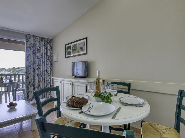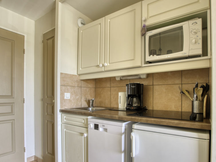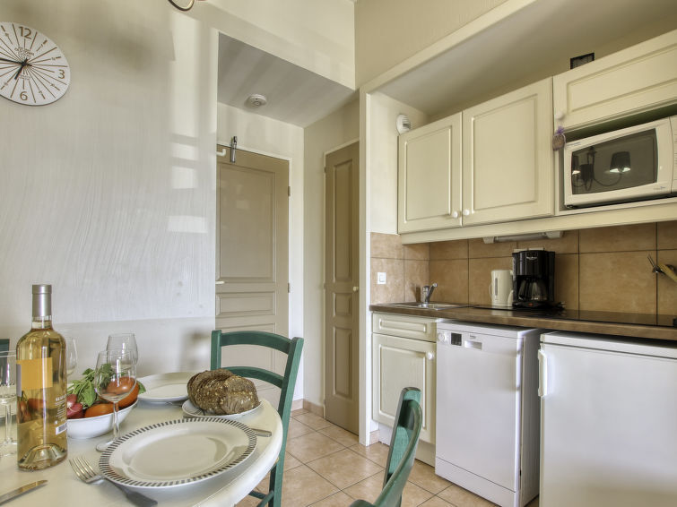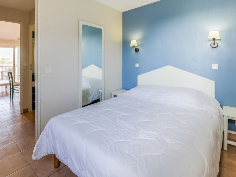 Appartement 2-kamers 28 m2 op de 2e verdieping. Doelmatig en mooi ingericht: woon-/eetkamer met 1 divanbed (160 cm, lengte 190 cm), TV (Flatscreen TV). Uitgang naar het terras. 1 kamer met 1 2-pers bed (1 x 140 cm, lengte 190 cm). Kookhoek (afwasmachine, 4 keramische glas kookplaten, magnetron, elektrische koffiemachine). Badkamer, aparte WC. Elektrische verwarming. Terras 9 m2, overdekt, op het noordwesten gelegen. Terrasmeubelen. Uitzicht op zee. Ter beschikking: Internet (WiFi, extra). Parkeerplaats nr. 565 (niveau 2) (overdekt), hoogte 190 cm, breedte 250 cm. Woning aan de straatzijde. TV alleen FR. Rookmelders.